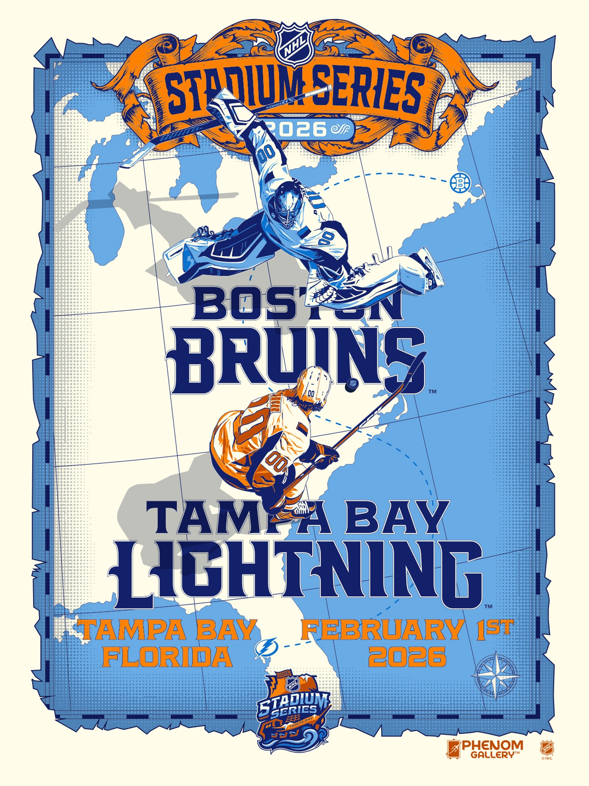 Details: 6-color silk-screen features the Boston Bruins and Tampa Bay Lightning playing at James Stadium for the 2026 Stadium Series Game.